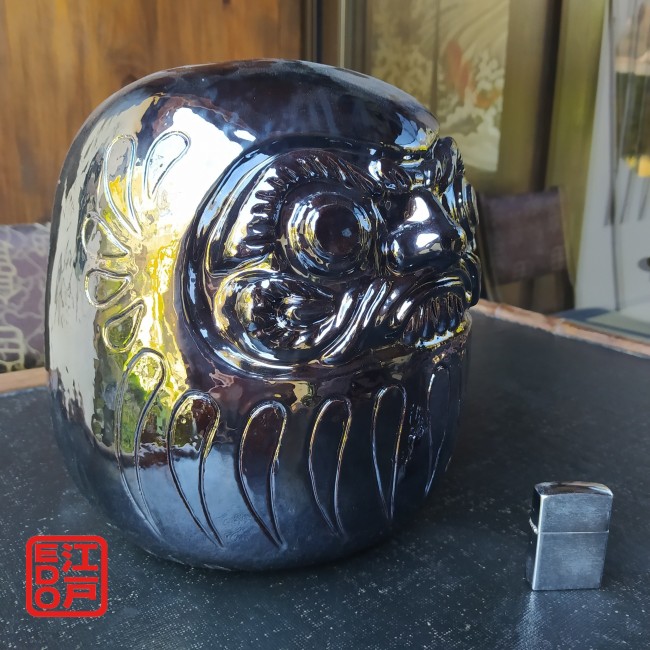 Ce Daruma décoratif en grès émail miroir,  de 4k150, de 25 cm de large et 27 cm de hauteur est adapté pour l'intérieur.